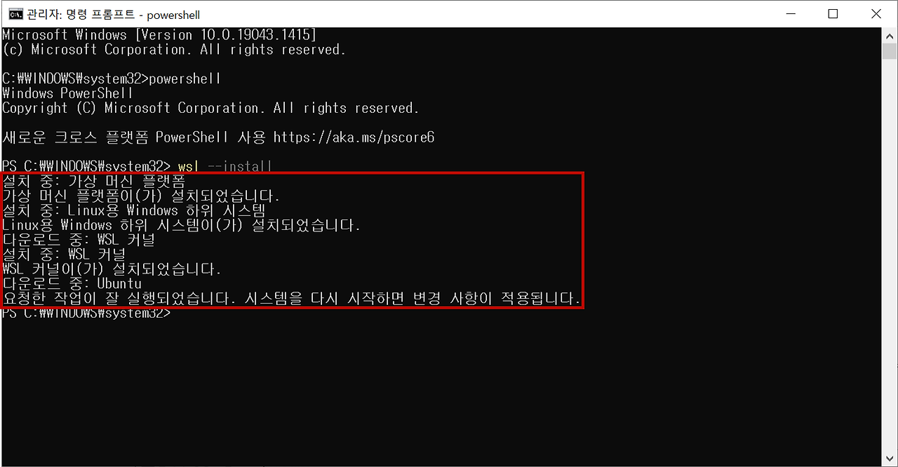 안내문구에 따라 컴퓨터를 재시작해주면 ubuntu가 설치되며 자동으로 실행 된다.