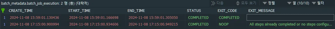 BATCH_JOB_EXECUTION: Job의 실행 상태(시작 시간, 종료 시간, 상태 등)를 기록하는 테이블입니다. Job의 성공 여부나 실패 상태, 그리고 현재 진행 상태를 저장하여 Job의 이력을 관리합니다.
