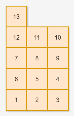 왼쪽에서 오른쪽으로 가면서 1번 상자부터 번호 순서대로 택배 상자를 한 개씩 놓습니다. 가로로 택배 상자를 w개 놓았다면 이번에는 오른쪽에서 왼쪽으로 가면서 그 위층에 택배 상자를 한 개씩 놓습니다. 그 층에 상자를 w개 놓아 가장 왼쪽으로 돌아왔다면 또다시 왼쪽에서 오른쪽으로 가면서 그 위층에 상자를 놓습니다. 이러한 방식으로 n개의 택배 상자를 모두 놓을 때까지 한 층에 w개씩 상자를 쌓습니다.